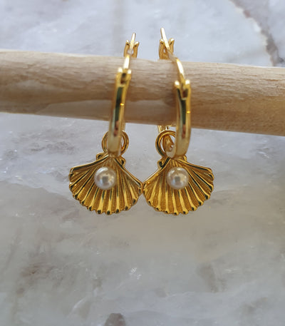 Beach Diva Seashell with Pearl Huggies in Gold AA